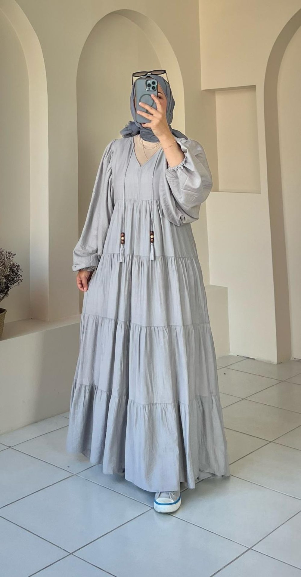 Rahatlığı ve zarafeti bir arada sunan balon kol elbisemiz,  gün boyu ferah bir kullanım sağlar. 140 cm uzunluğu ile tam boy kapatıcılık sunarken, kat kat tasarımı şıklığınıza modern bir hava katıyor.