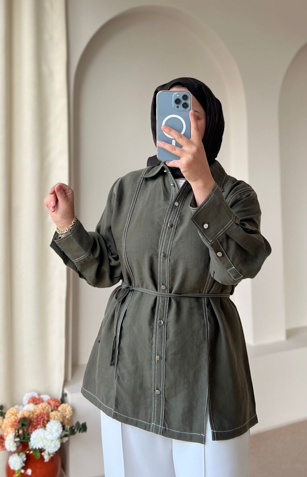 Kadın Gardenya Çift Dikiş Detaylı Gömlek Haki