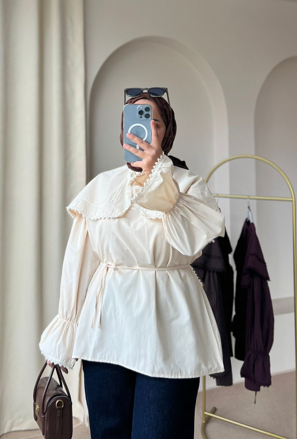 Kadın Şal Yaka Dantelli Gömlek Krem